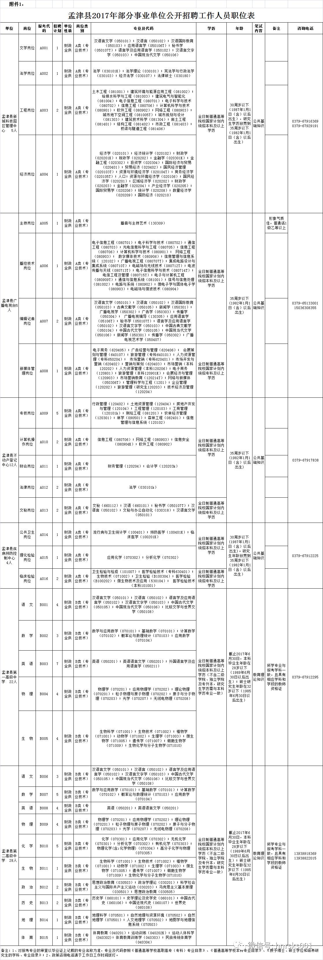 1、孟津县2017年部分事业单位公开招聘工作人员职位表